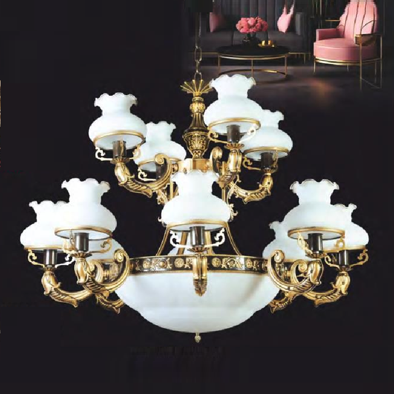 - Sản phẩm: NC 8005/12: Đèn chùm 12 tay, chao thủy tinh - KT: Ø1000mm x H800mm +400mm - Bóng đèn E27 x 15 bóng