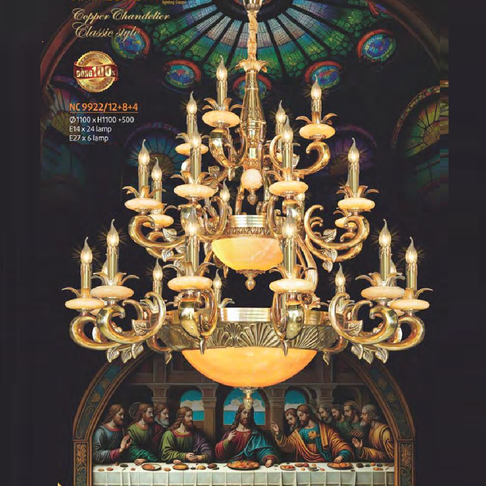 - Sản phẩm: NC 9922/12+8+4: Đèn chùm đồng, chao đá 24 tay - KT: Ø1100mm x H1100mm +500mm - Bóng đèn nến E14 x 24 bóng + E27 x 6 bóng