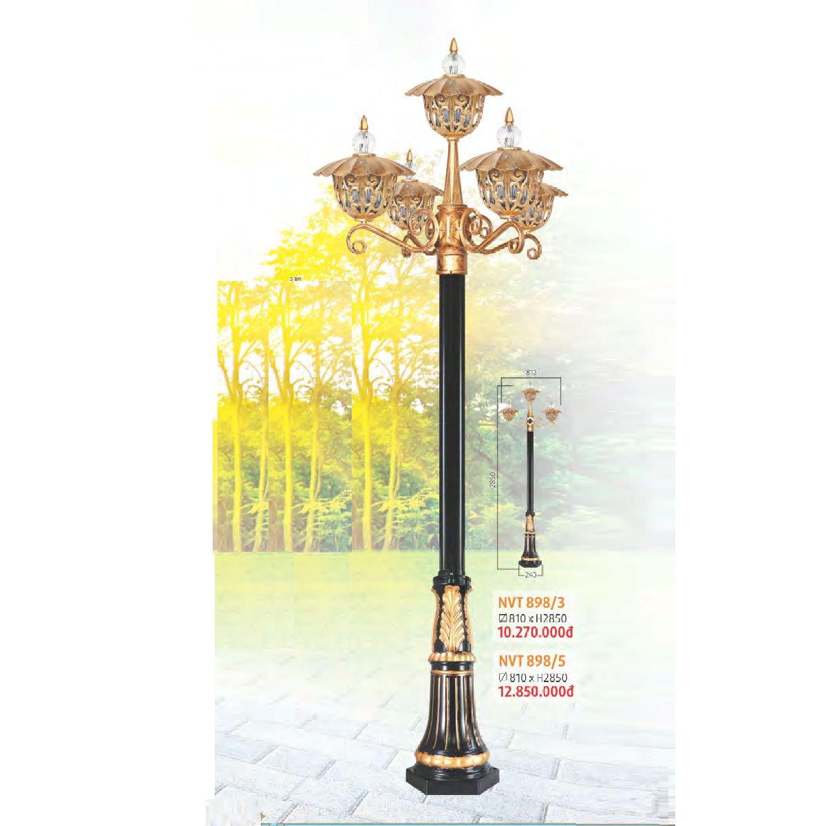 - Sản phẩm: NVT 898/5: Đèn trụ sân vườn hợp kim 5 tay