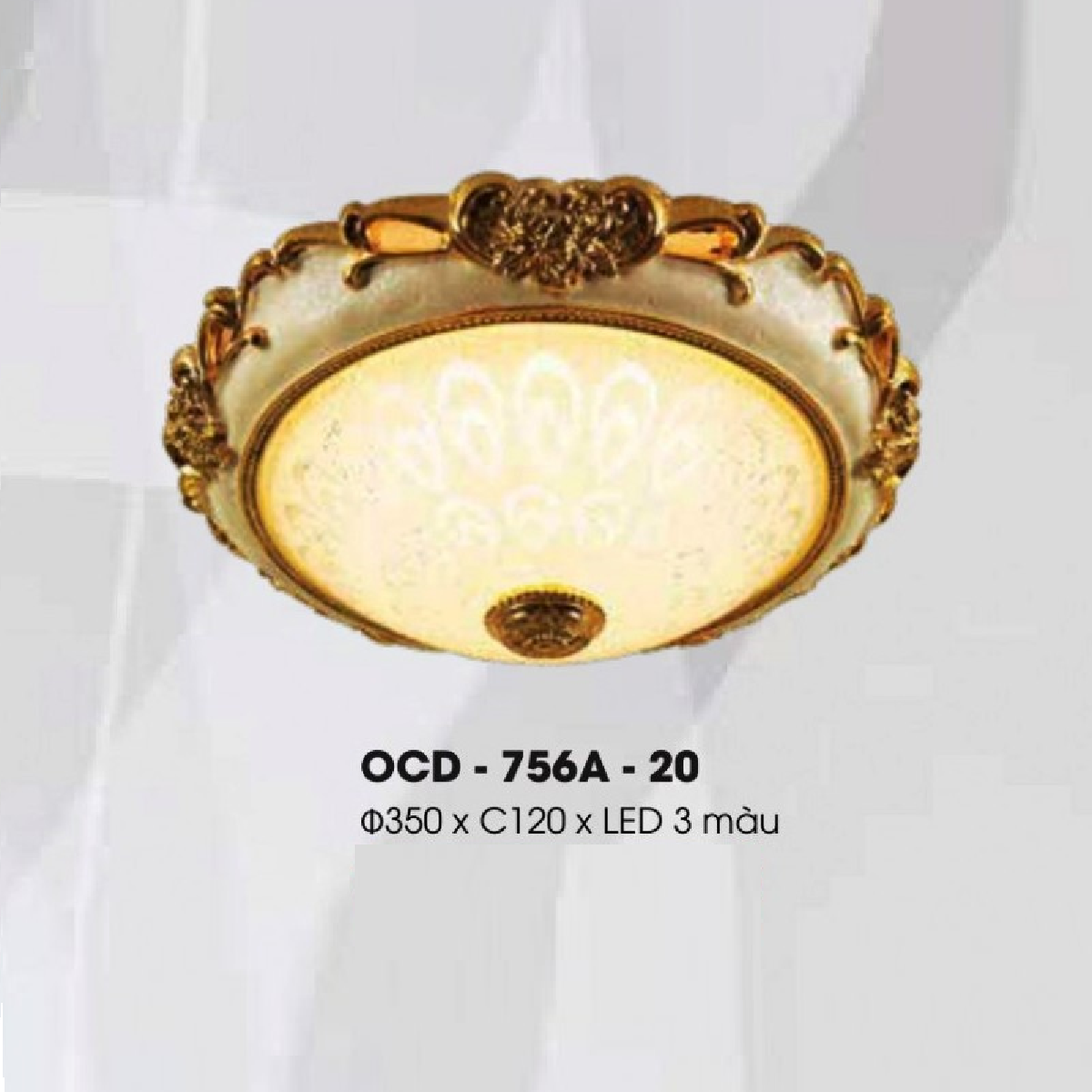 OCD - 756A - 20: Đèn ốp trần  hợp kim chóa thủy tinh - KT: Ø350mm x H120mm - Đèn LED đổi 3 màu