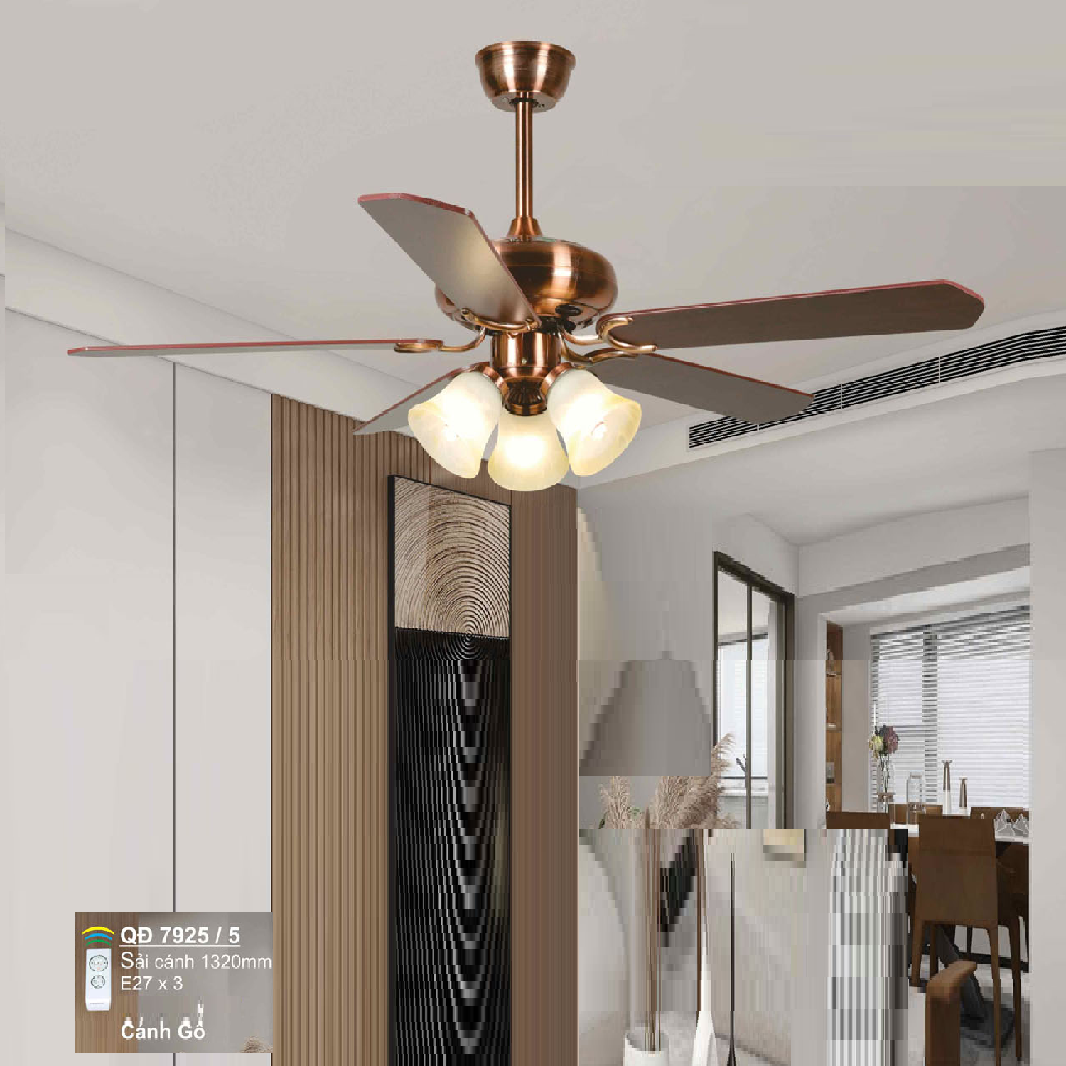QD 7925/5: Quạt trần đèn 5 cánh gỗ, chao đèn thủy tinh