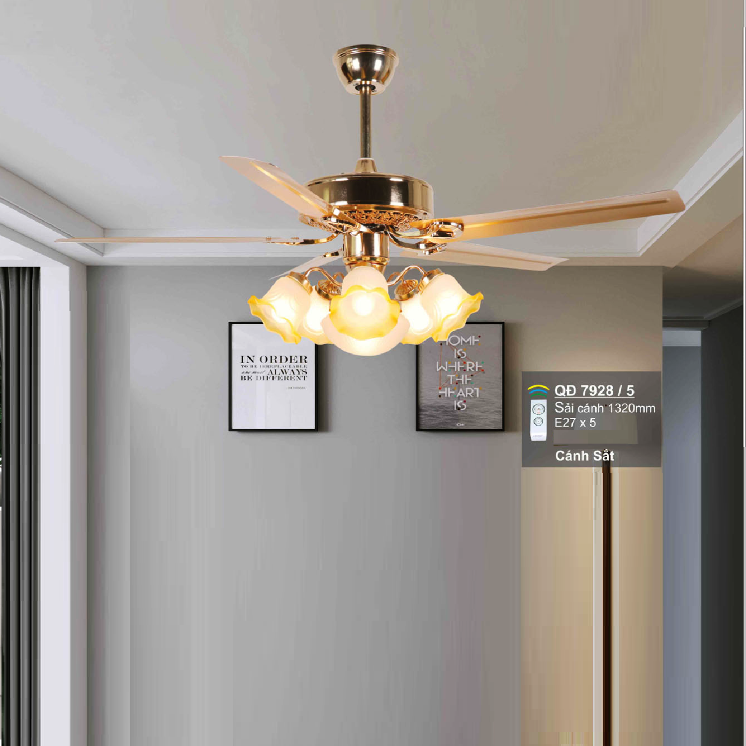 • Sản phẩm: QD 7928/5: Quạt trần đèn 5 cánh sắt, chao đèn thủy tinh