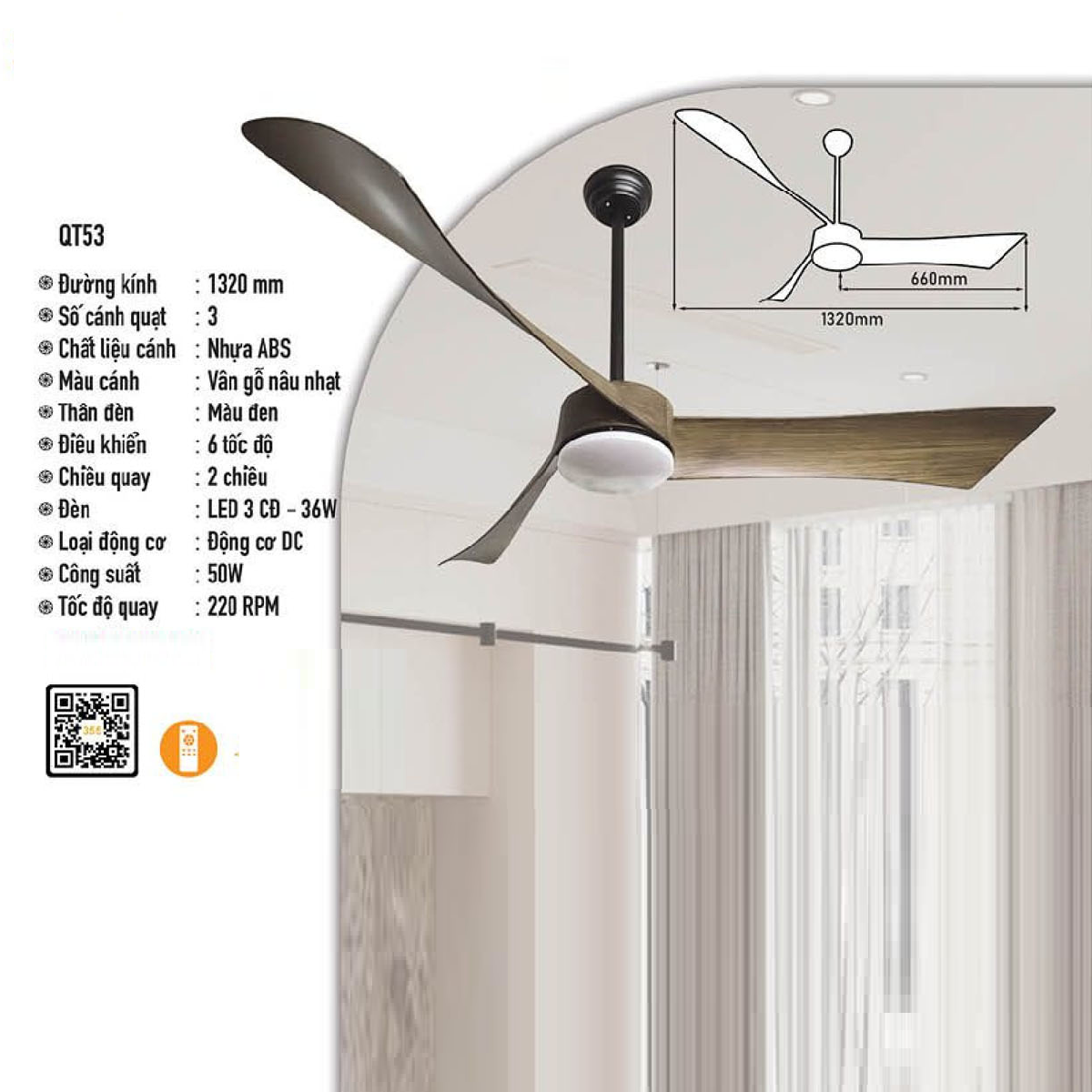 QT53: Quạt trần đèn LED 3 cánh nhựa ABS