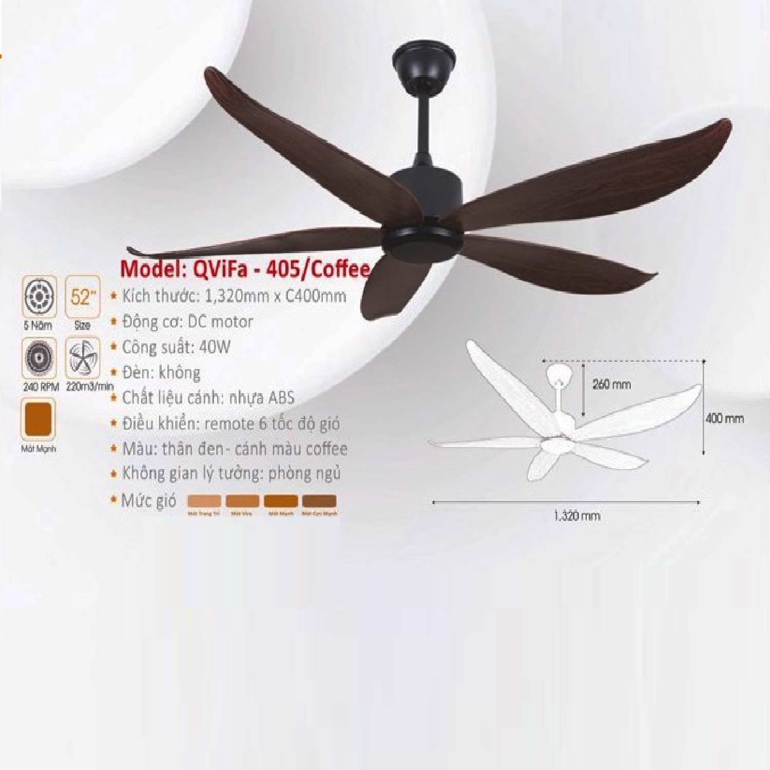 • Sản phẩm: QViFa - 405/Coffee: Quạt trần 5 cánh nhựa màu Coffee