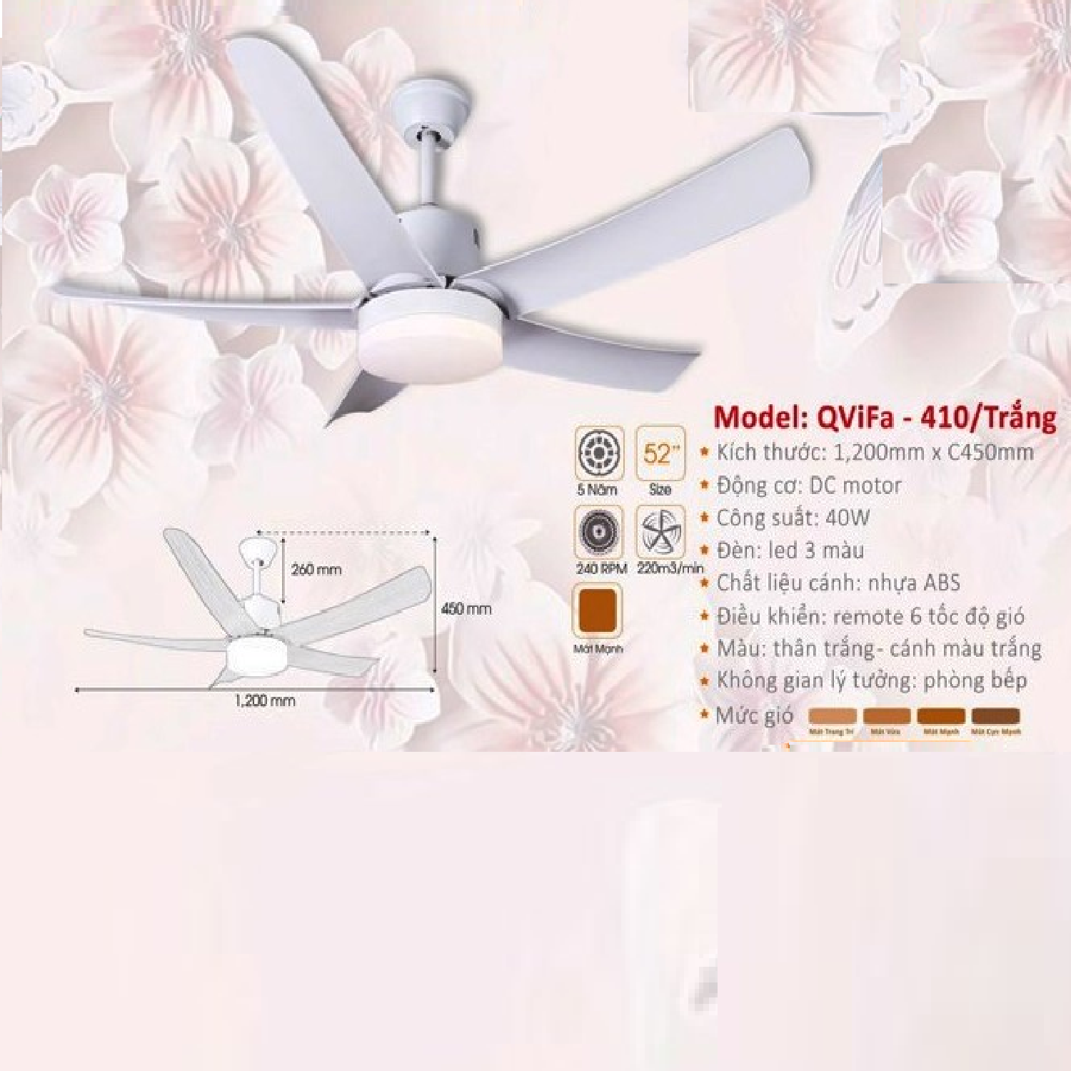 • Sản phẩm: QViFa - 410/Trắng: Quạt trần đèn LED 5 cánh nhựa màu trắng