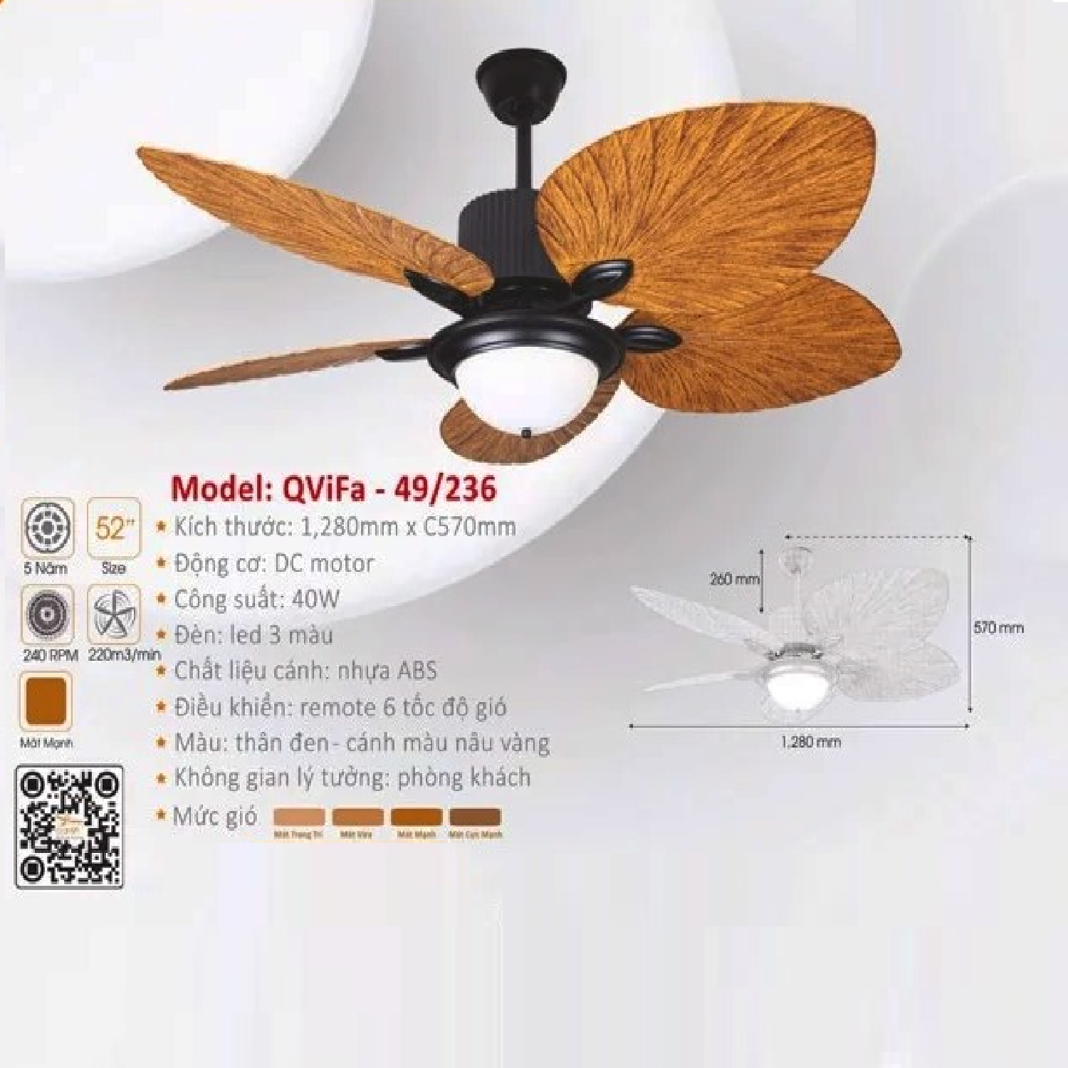 - Sản phẩm: QViFa - 49/236: Quạt trần đèn 5 cánh nhựa hình lá cọ