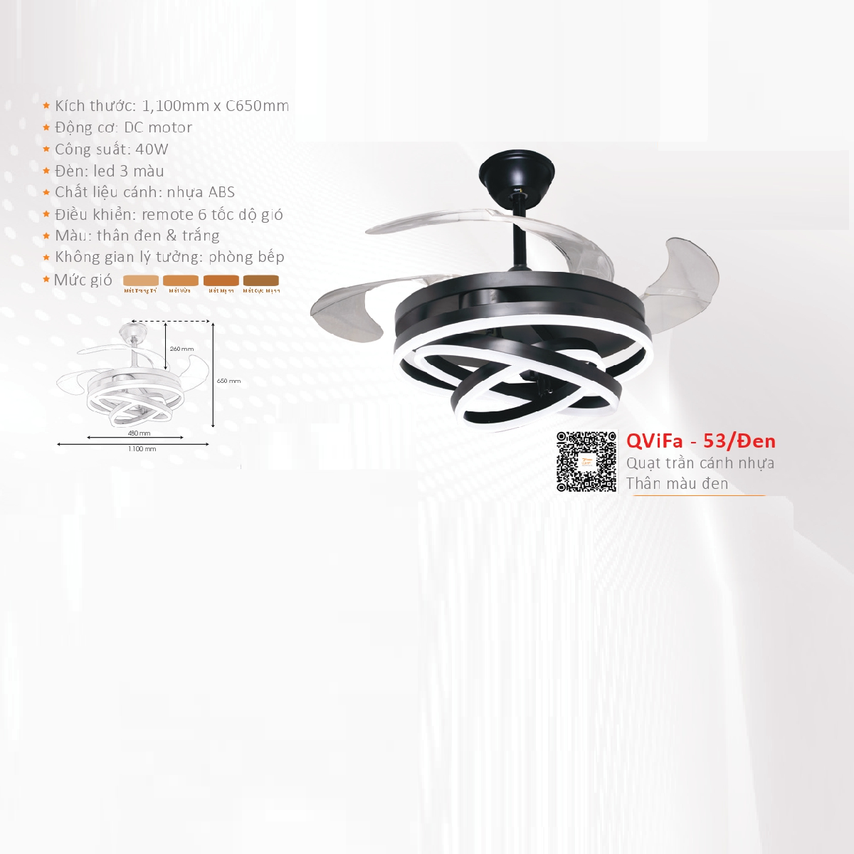 - Sản phẩm: QVifa - 53/Đen: Quạt trần đèn LED cánh nhựa, thân màu đen