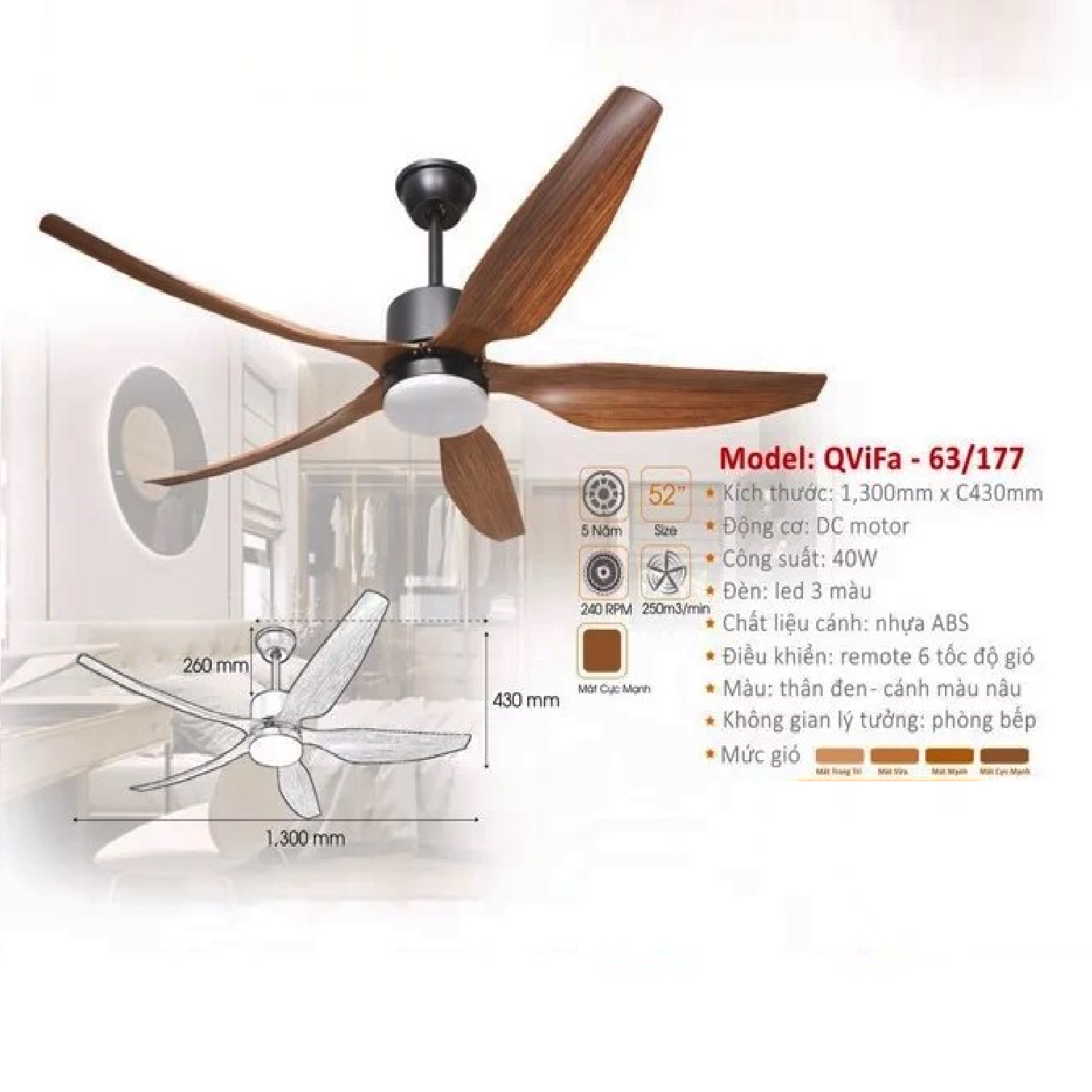 - Sản phẩm: QViFa - 63/177: Quạt trần đèn 5 cánh nhựa