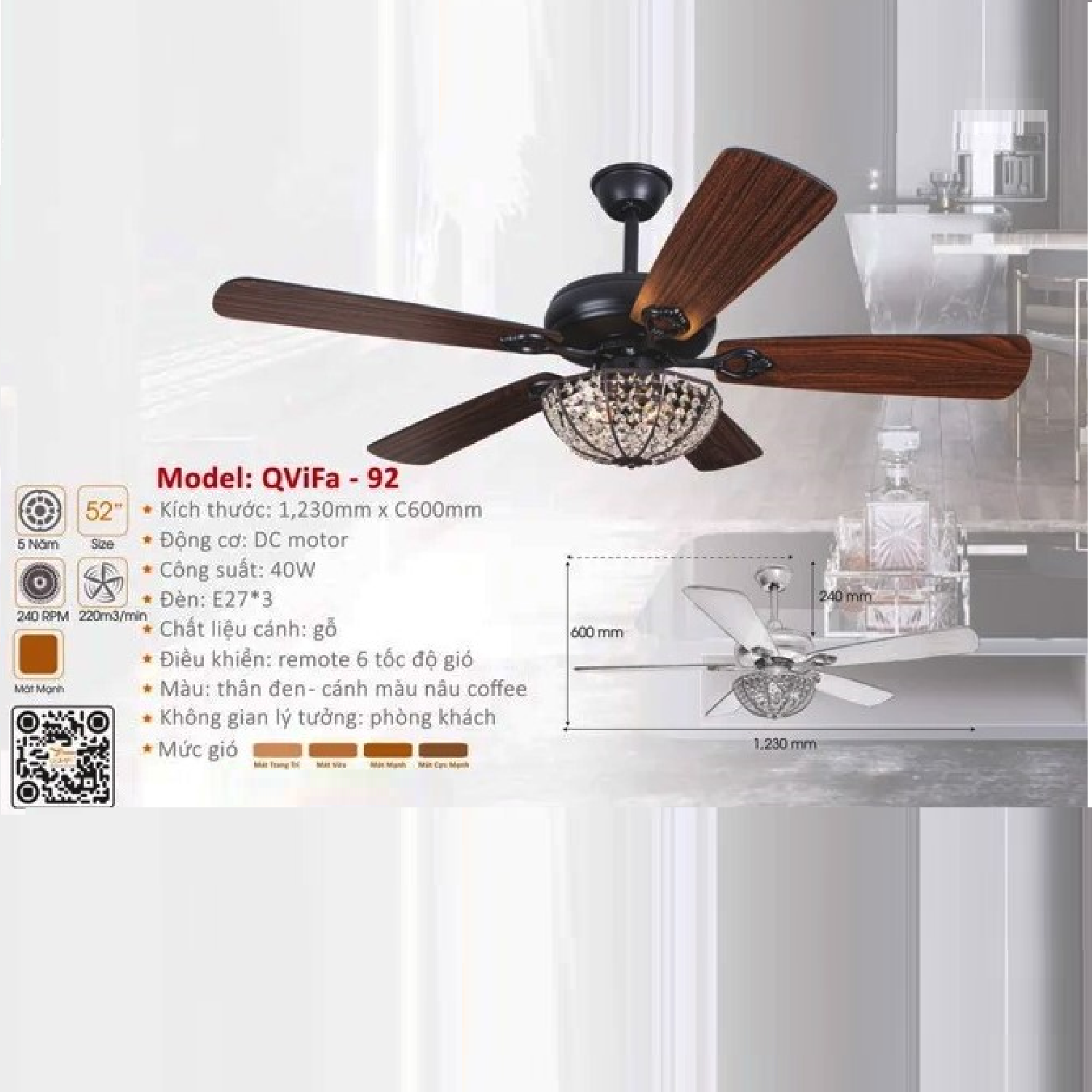 • Sản phẩm: QViFa - 92: Quạt trần đèn 5 cánh gỗ công nghiệp