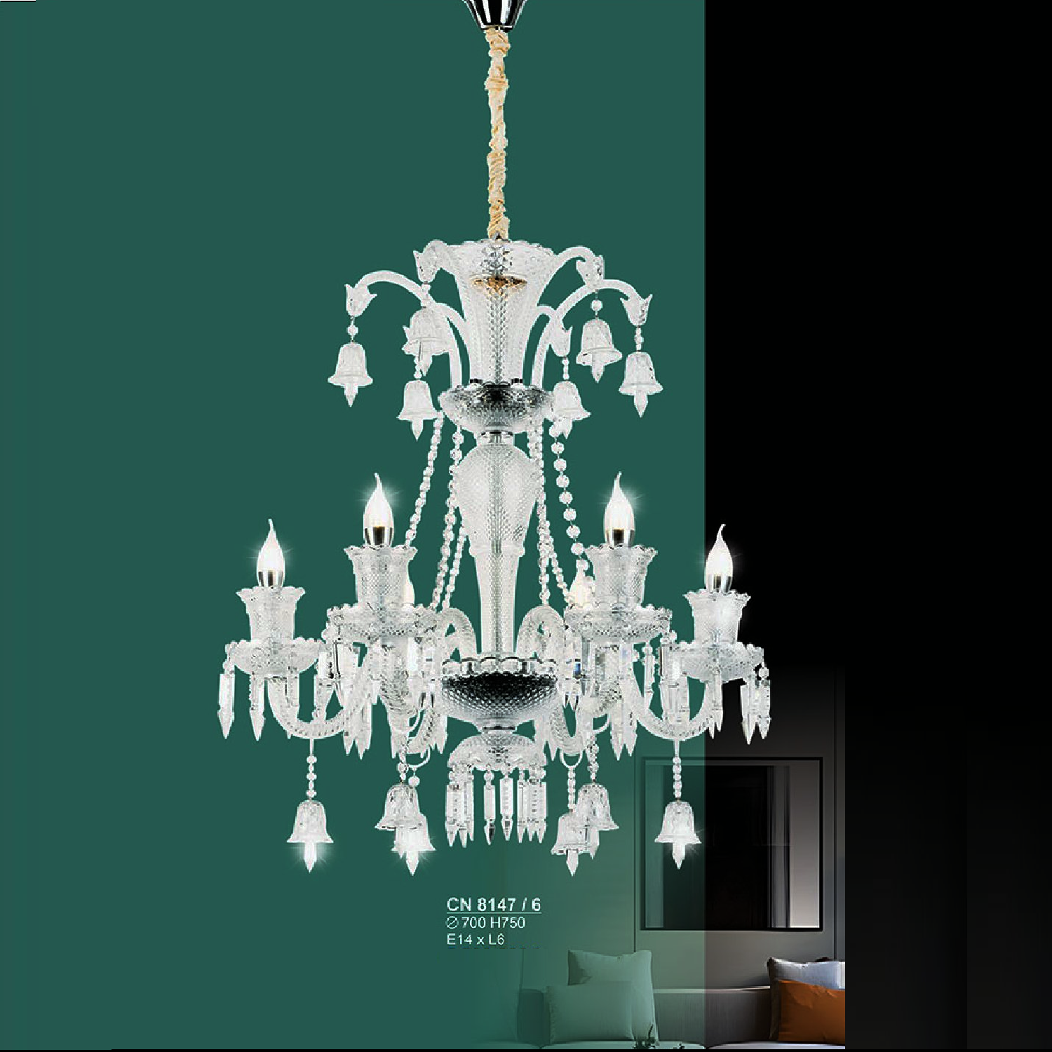 - Sản phẩm: S - CN 8147/6: Đèn chùm nến 6 tay - KT: Ø700mm x H750mm - Bóng đèn E14 x 6 bóng