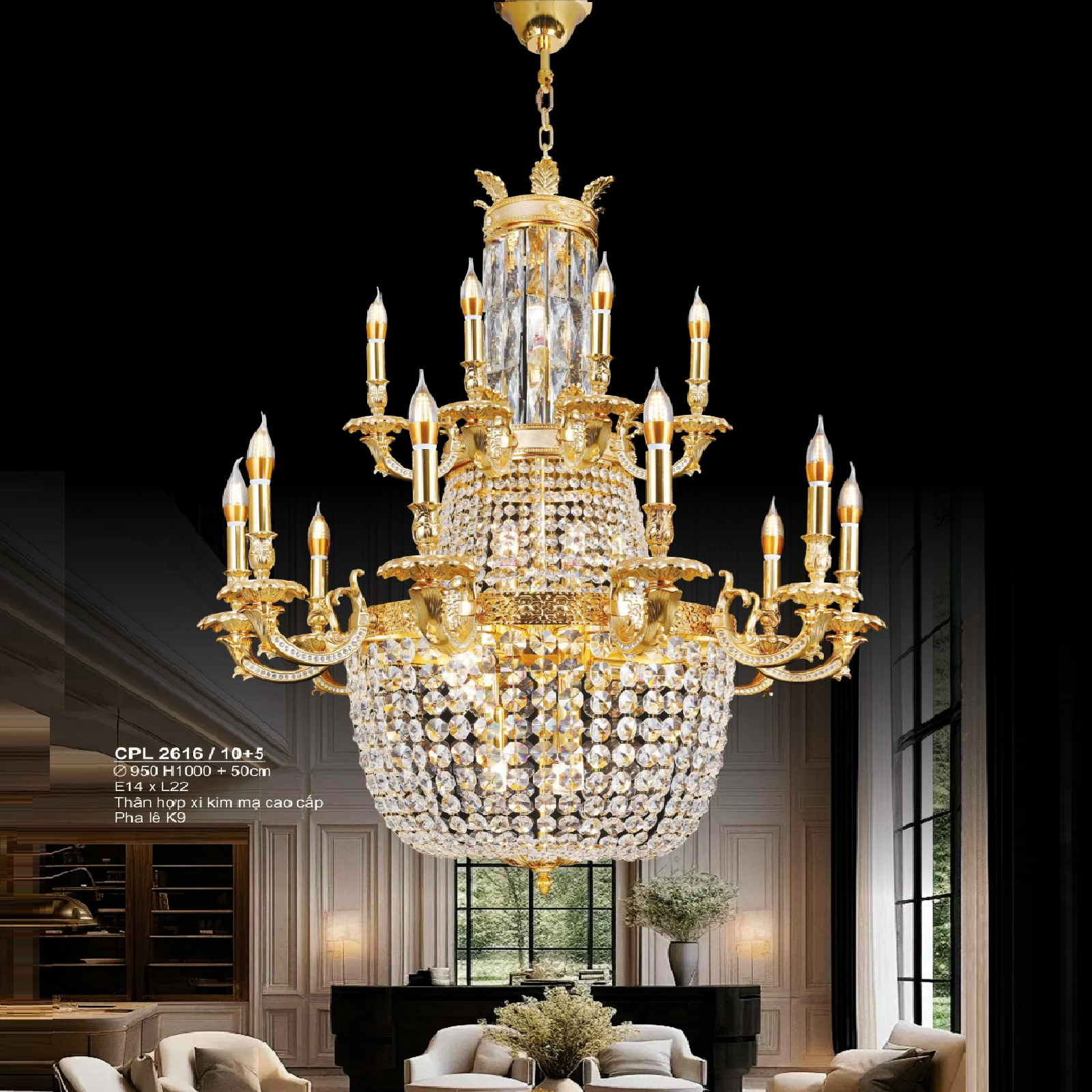 5. S - CPL 2616/10+5: Đèn chùm Phale nến 15 tay - KT: Ø950mm x H1000mm + 500mm - Bóng đèn E14 x 22 bóng