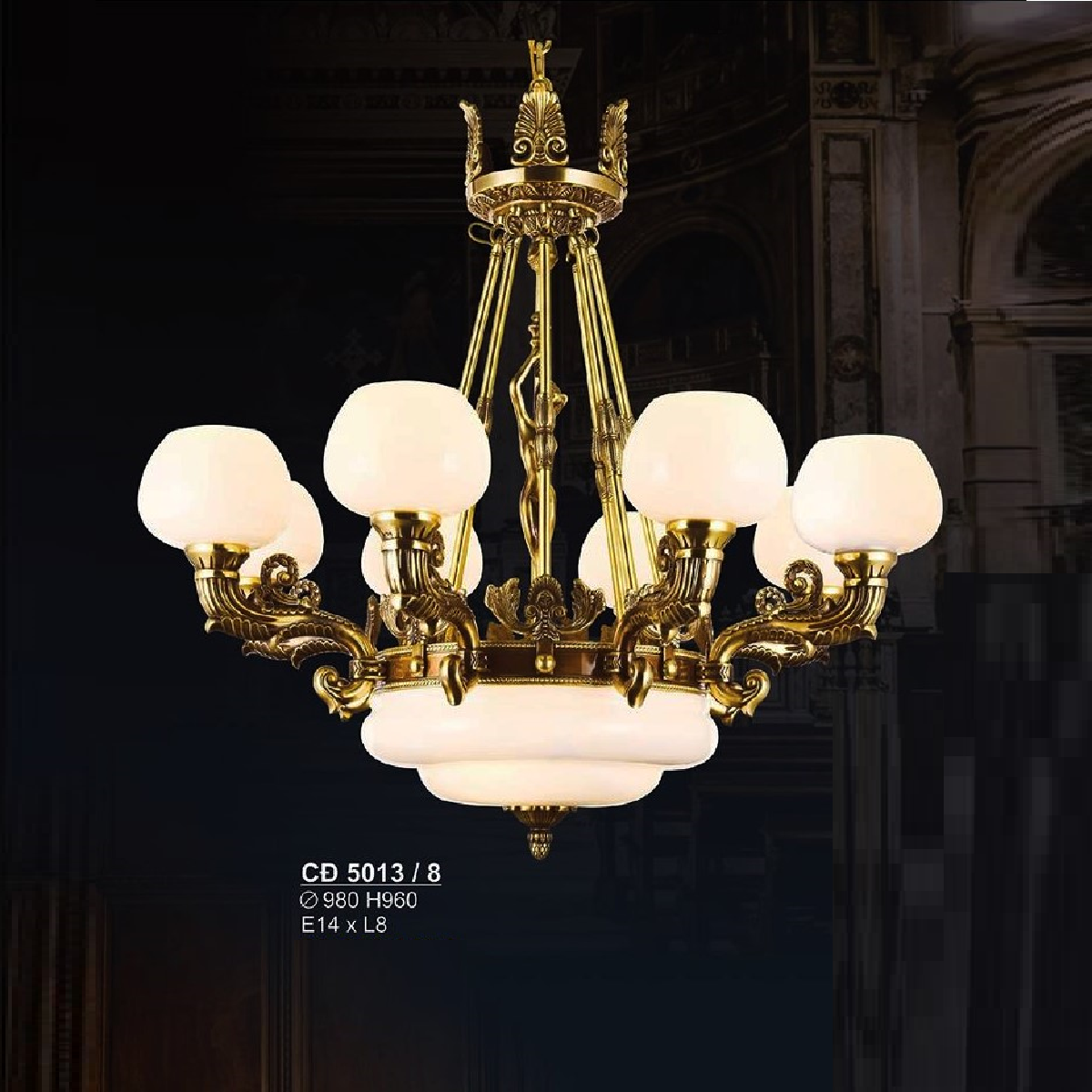 - Sản phẩm: S - CĐ 5013/8: Đèn chùm đồng 8 tay chao thuỷ tinh - KT: Ø 980mm x H960mm - Bóng đèn chân E14 x 8 bóng