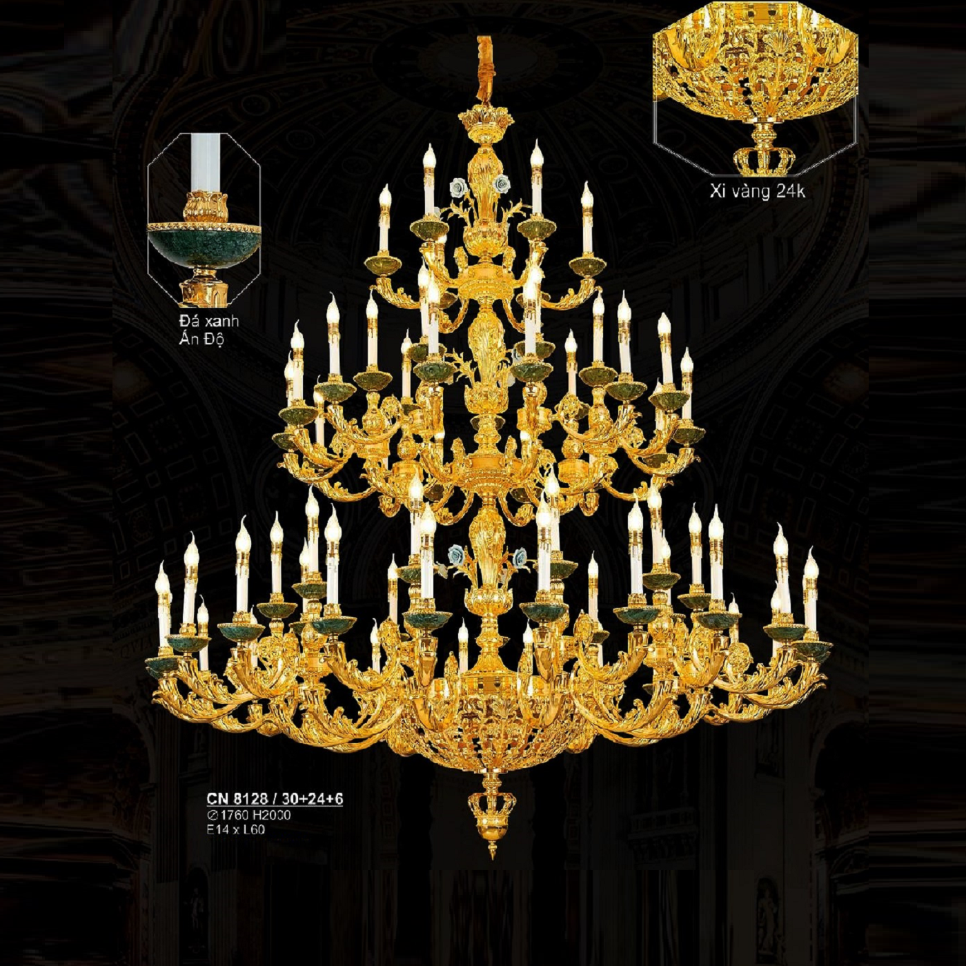 - Sản phẩm: S - CN 8128/30+24+6: Đèn chùm nến 60 tay - KT: Ø1760mm x H2000mm - Bóng đèn nến E14 x 60 bóng