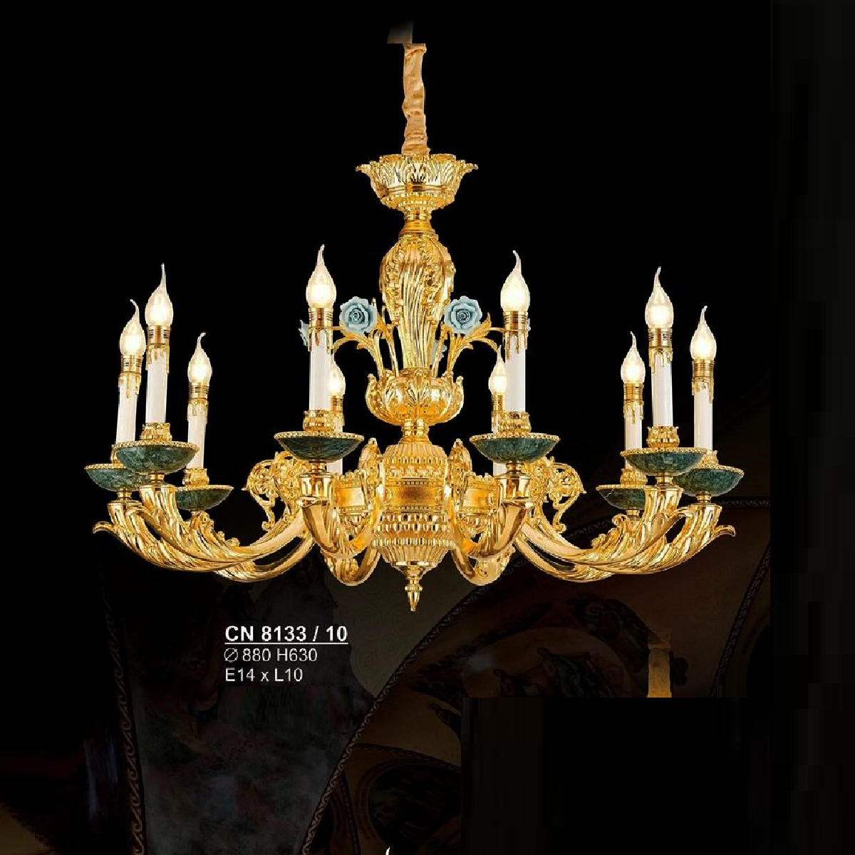 - Sản phẩm: S - CN 8133/10: Đèn chùm nến 10 tay - KT: Ø880mm x H630mm - Bóng đèn nến E14 x 10 bóng
