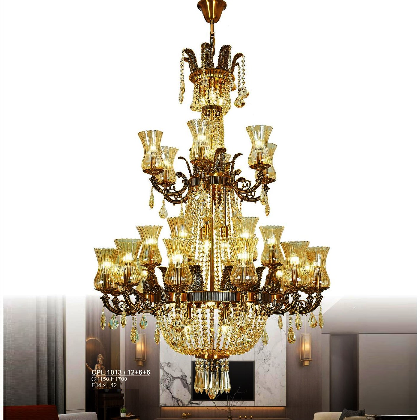 • Sản phẩm: S - CPL 1013/12+6+6: Đèn chùm Phale chao thủy tinh 24 tay - KT: Ø1150mm x H1700mm - Bóng đèn E14 x 42 bóng