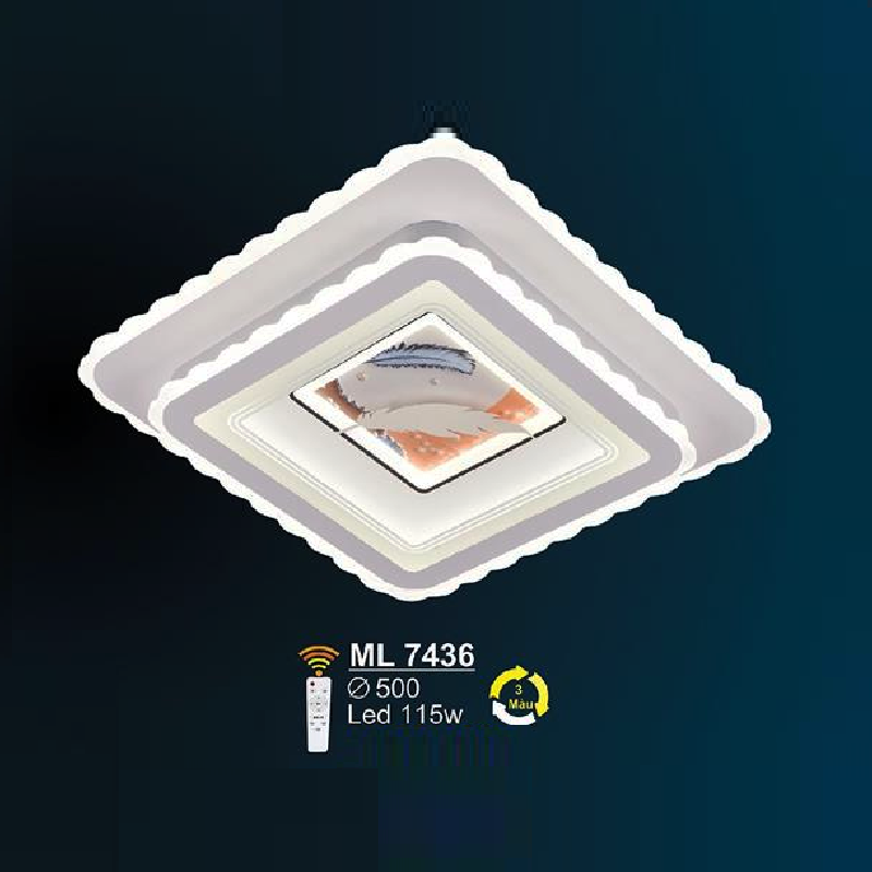 - Sản phẩm: SN - ML 7436: Đèn áp trần LED Mica Vuông - KT: L500mm x W500mm - Đèn LED 115W - Ánh sáng đổi 3 màu - Remote