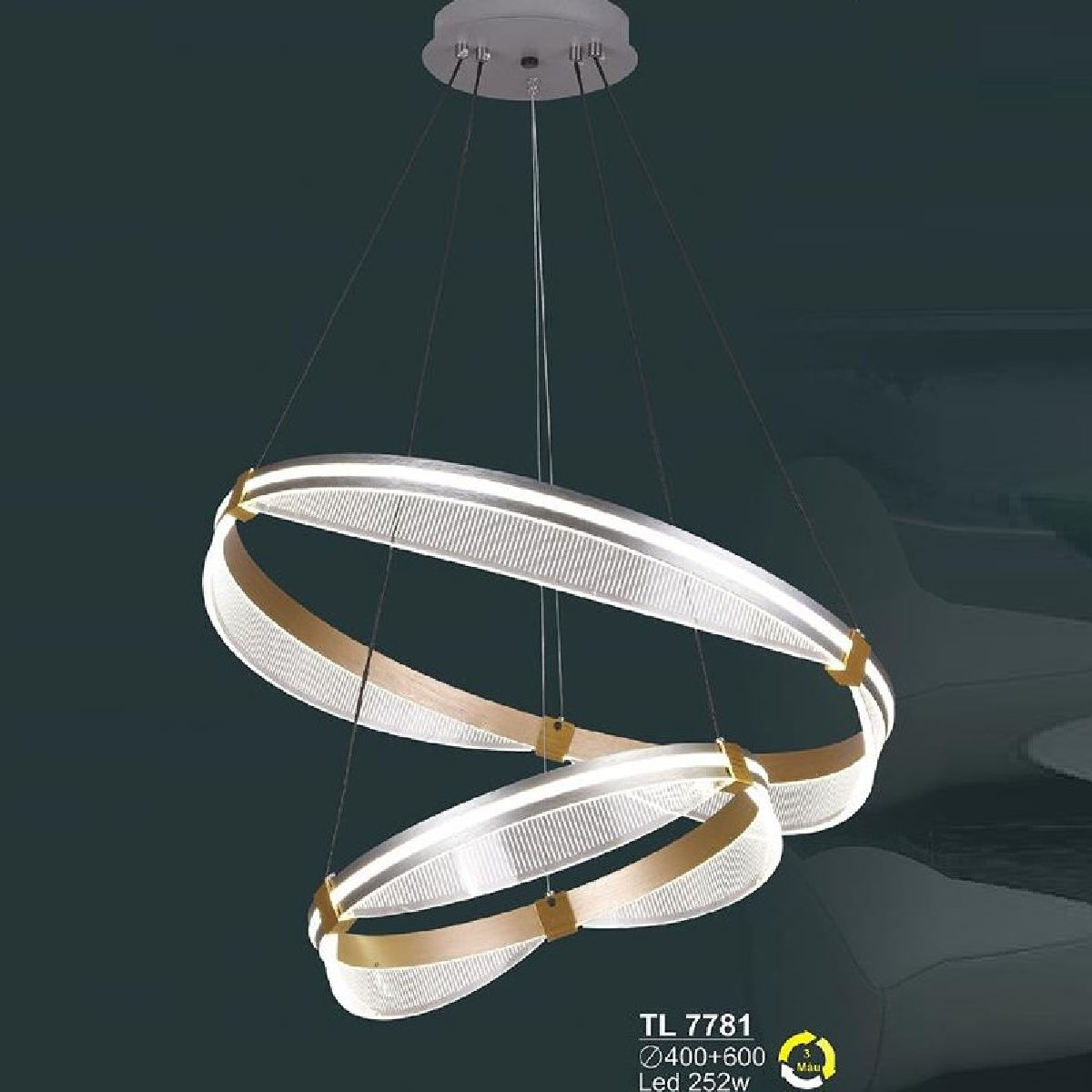 - Sản phẩm: SN - T 7781: Đèn thả 2 vòng LED - KT: Ø400mm+Ø600mm - Đèn LED 252W ánh sáng đổi 3 màu