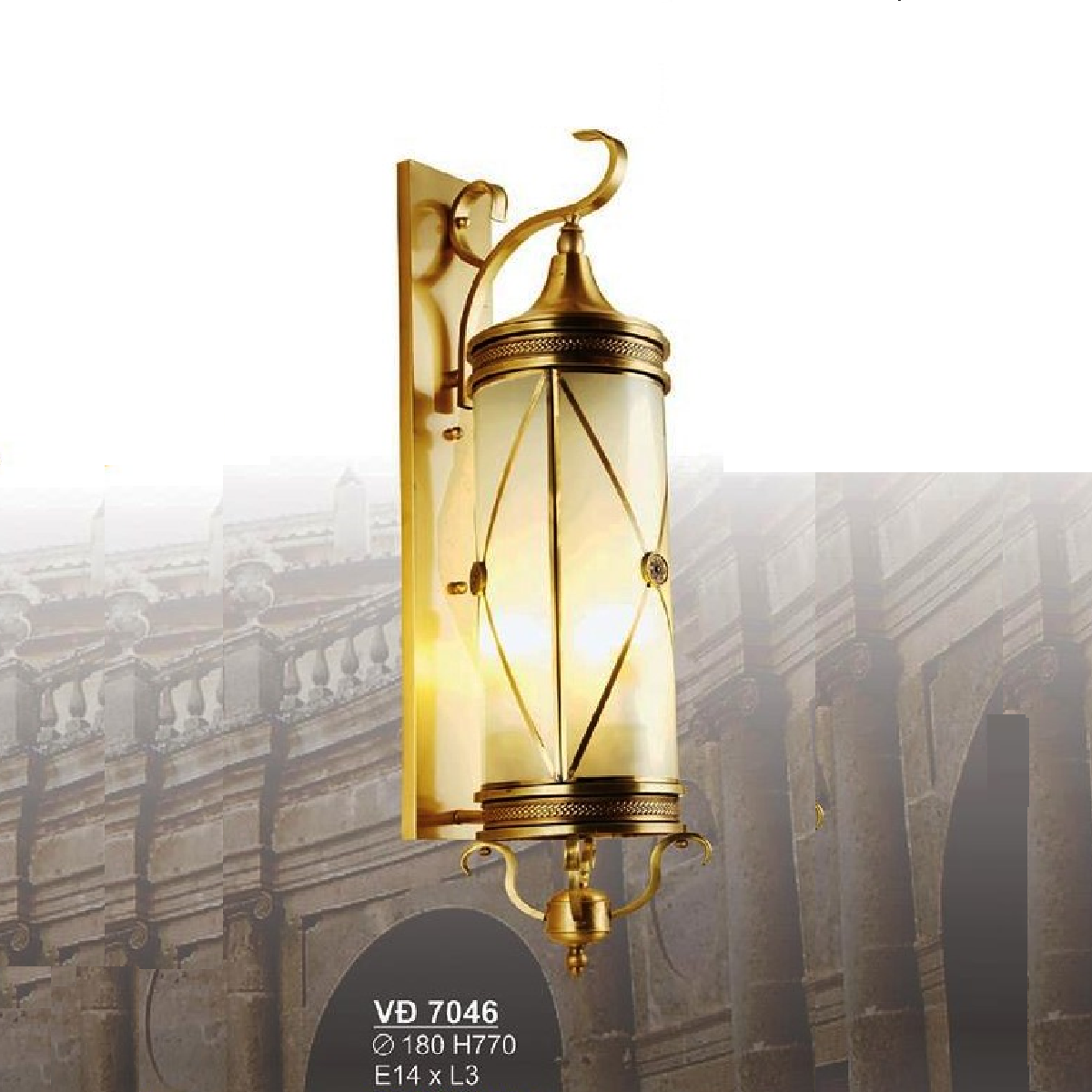 - Sản phẩm: SN - VĐ 7046: Đèn vách đồng chóa thủy tinh - KT: Ø180mm x H770mm - Đèn chân E14 x 3 bóng