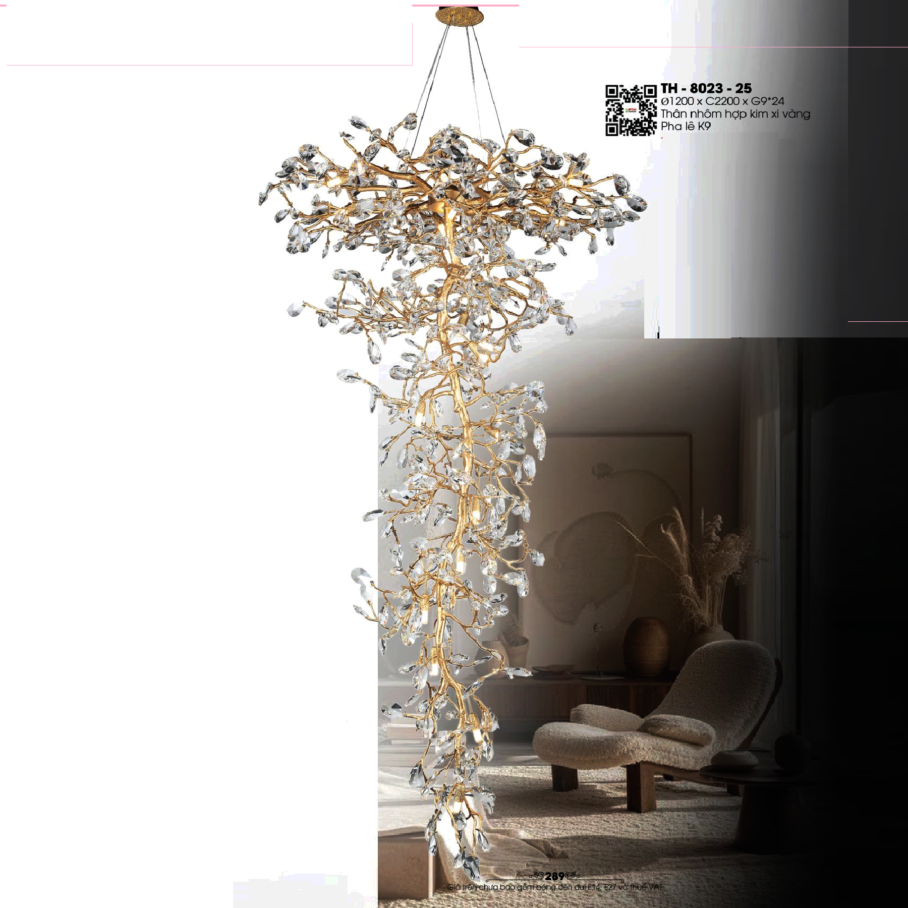 - Sản phẩm: TH - 8023-25: Đèn thả 5 tầng LED Phale K9 - KT: Ø1200 mm x H2200mm - Bóng Đèn LED G9 x 24 bóng