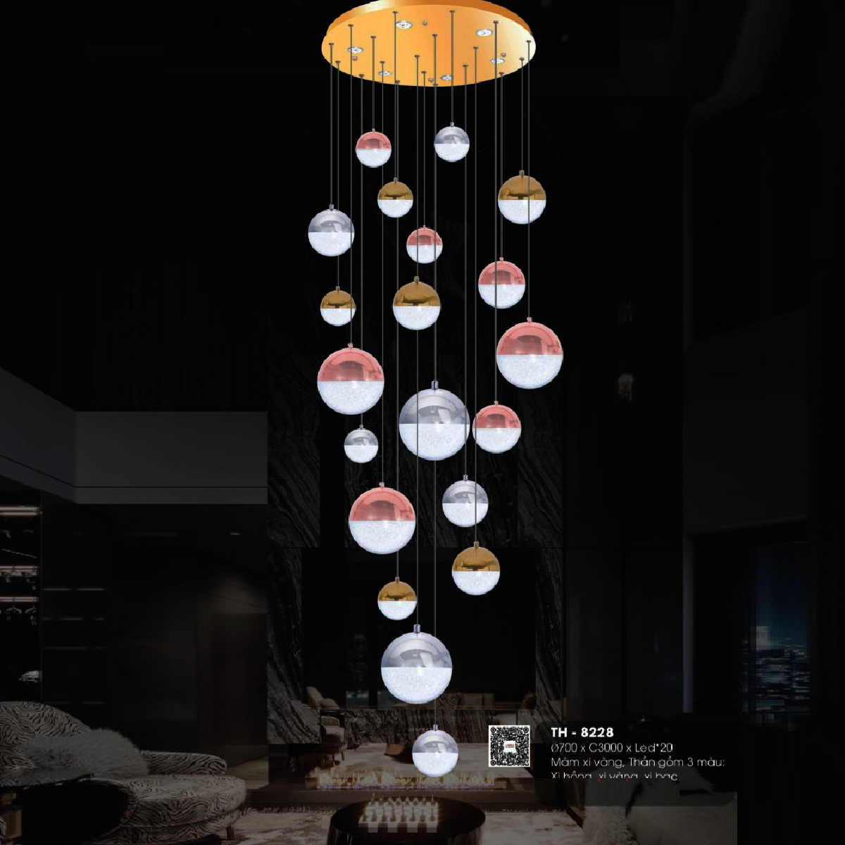 - Sản phẩm: TH - 8228: Đèn thả LED chao quả bi - KT: Ø700mm x H3000mm - Đèn LED
