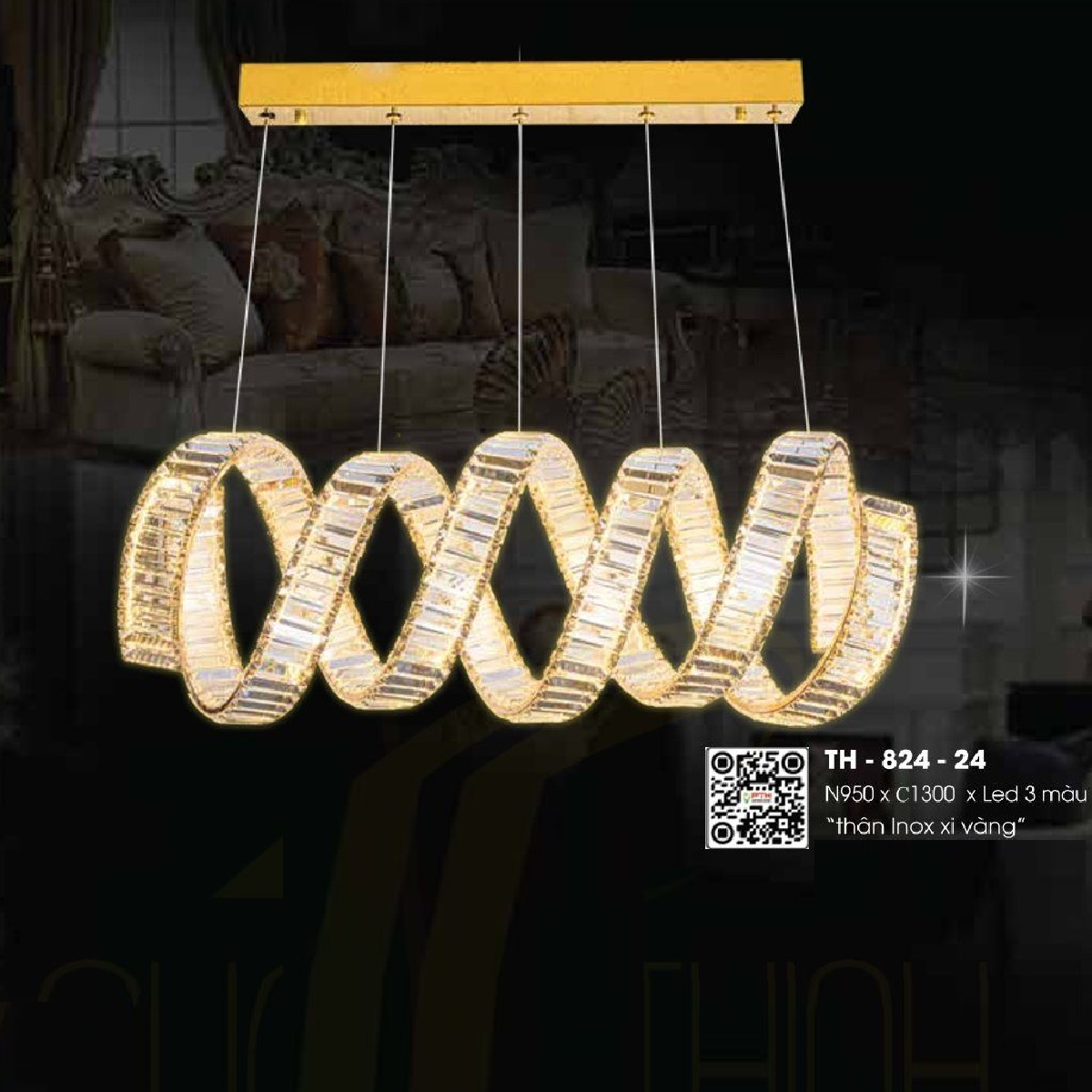 3. TH - 824-24: Đèn thả ngang LED Phale dạng xoắn, Thân Inox xi vàng - KT: L950mm x H1300mm - Bóng đèn LED đổi 3 màu