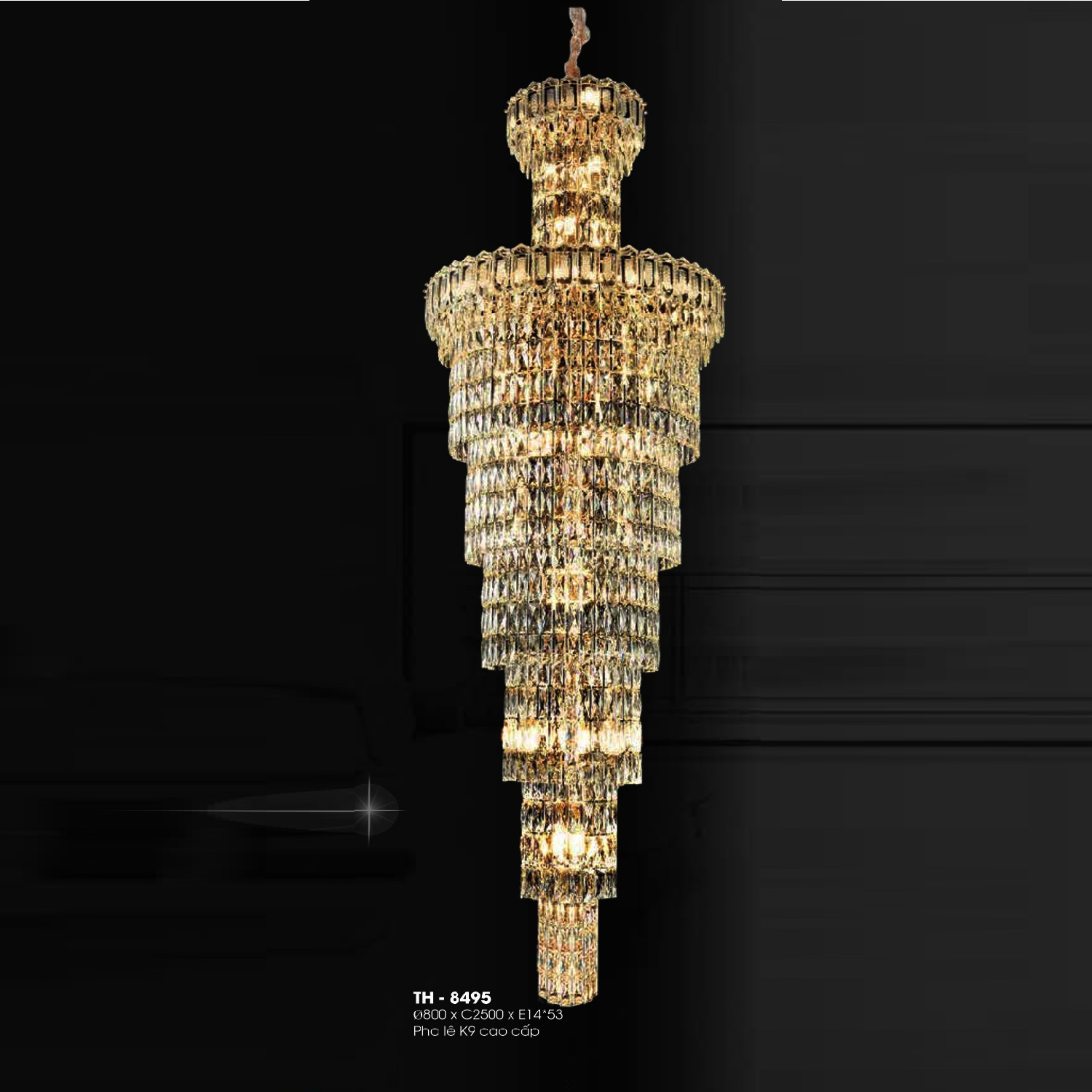 - Sản phẩm: TH - 8495: Đèn thả Phale K9 cao cấp - KT: Ø800mm x H2500mm - Bóng đèn E14 x 53 bóng