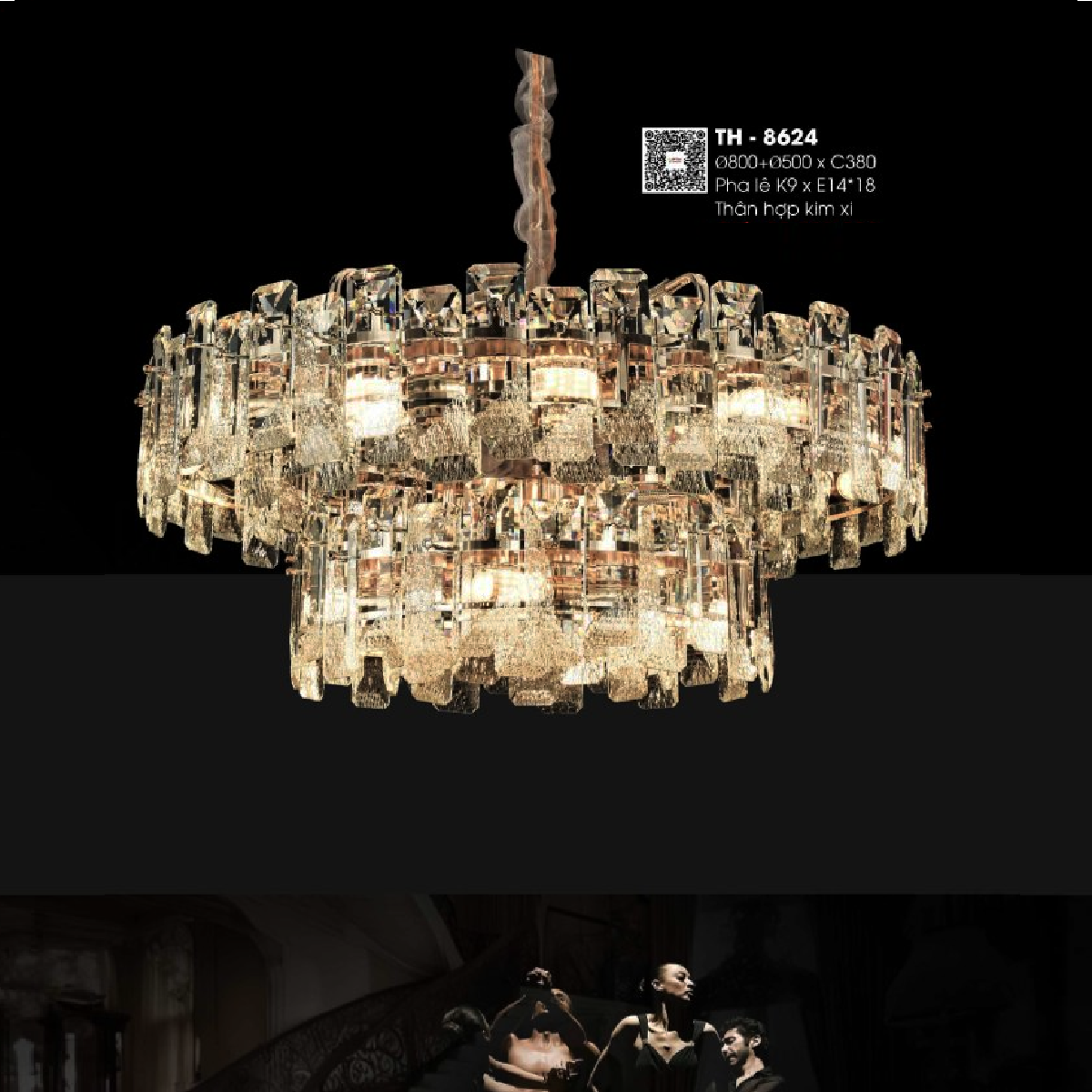 - Sản phẩm: TH - 8624: Đèn thả 2 tầng Phale K9 - KT: Ø800mm + Ø500mmx H380mm - Bóng đèn E14 x 18
