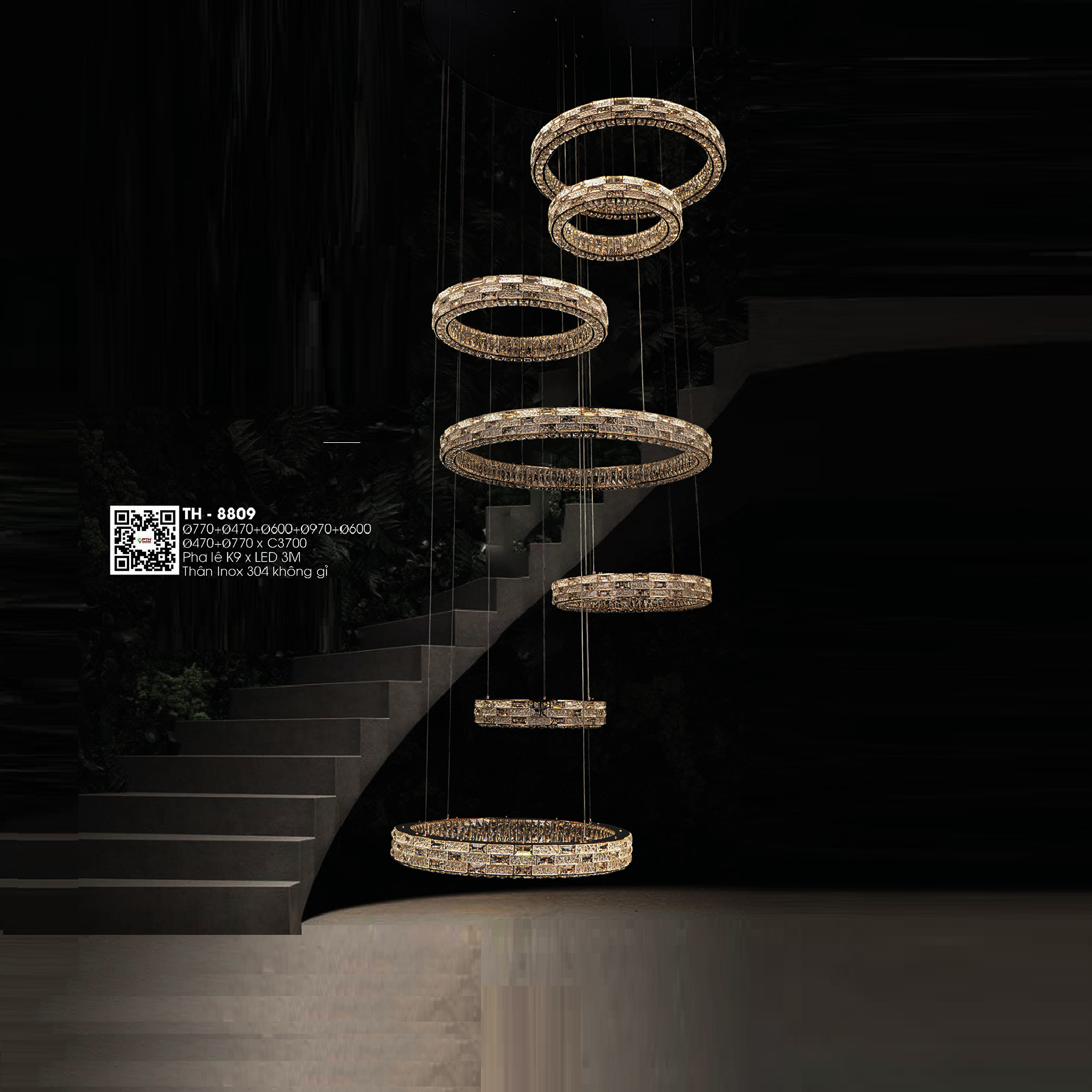 5. TH - 8809: Đèn thả LED Phale K9 7 vòng - KT: Ø(770 + 470 + 600 + 970 + 600 + 470 + 770)mm x H3700mm - Đèn LED đổi 3 màu