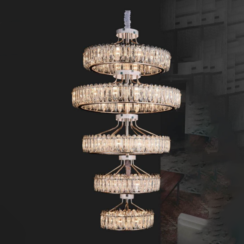 - Sản phẩm: 355 - TPL 2199T5: Đèn thả 5 vòng Phale K9 cao cấp - KT: Ø(800 mm +1000mm + 800mm + 600mm +500mm) x H2100mm - Đèn chân E14 x 58 bóng