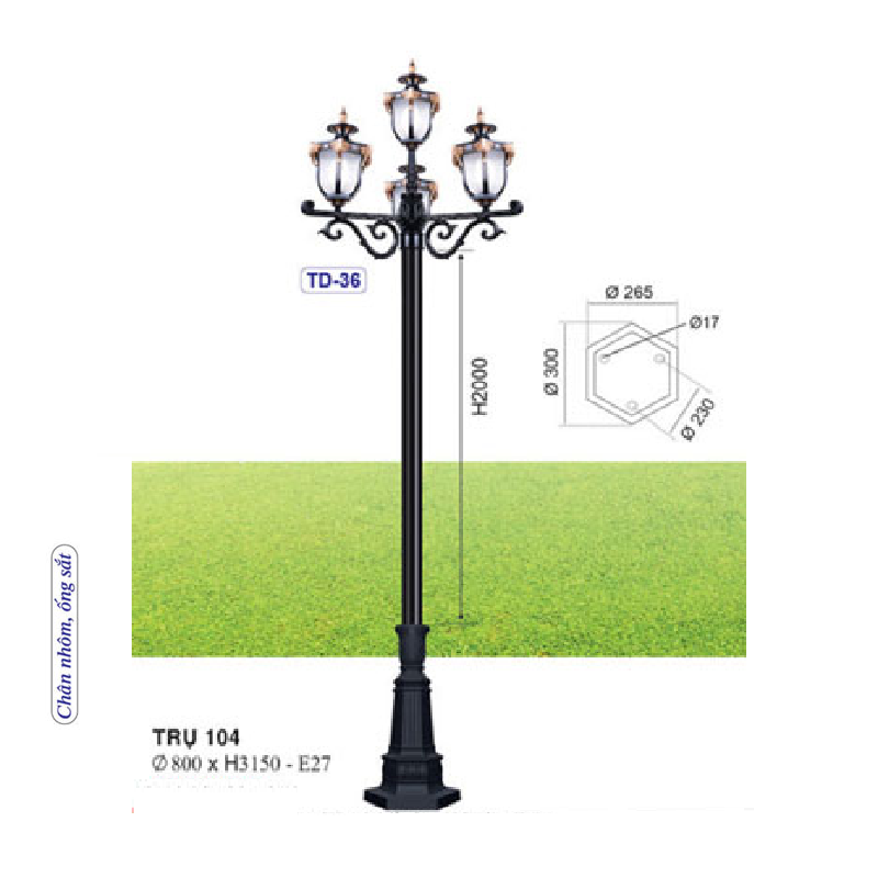 - Sản phẩm: TRỤ 104: Đèn trụ sân vườn chất liệu hợp kim 4 bóng