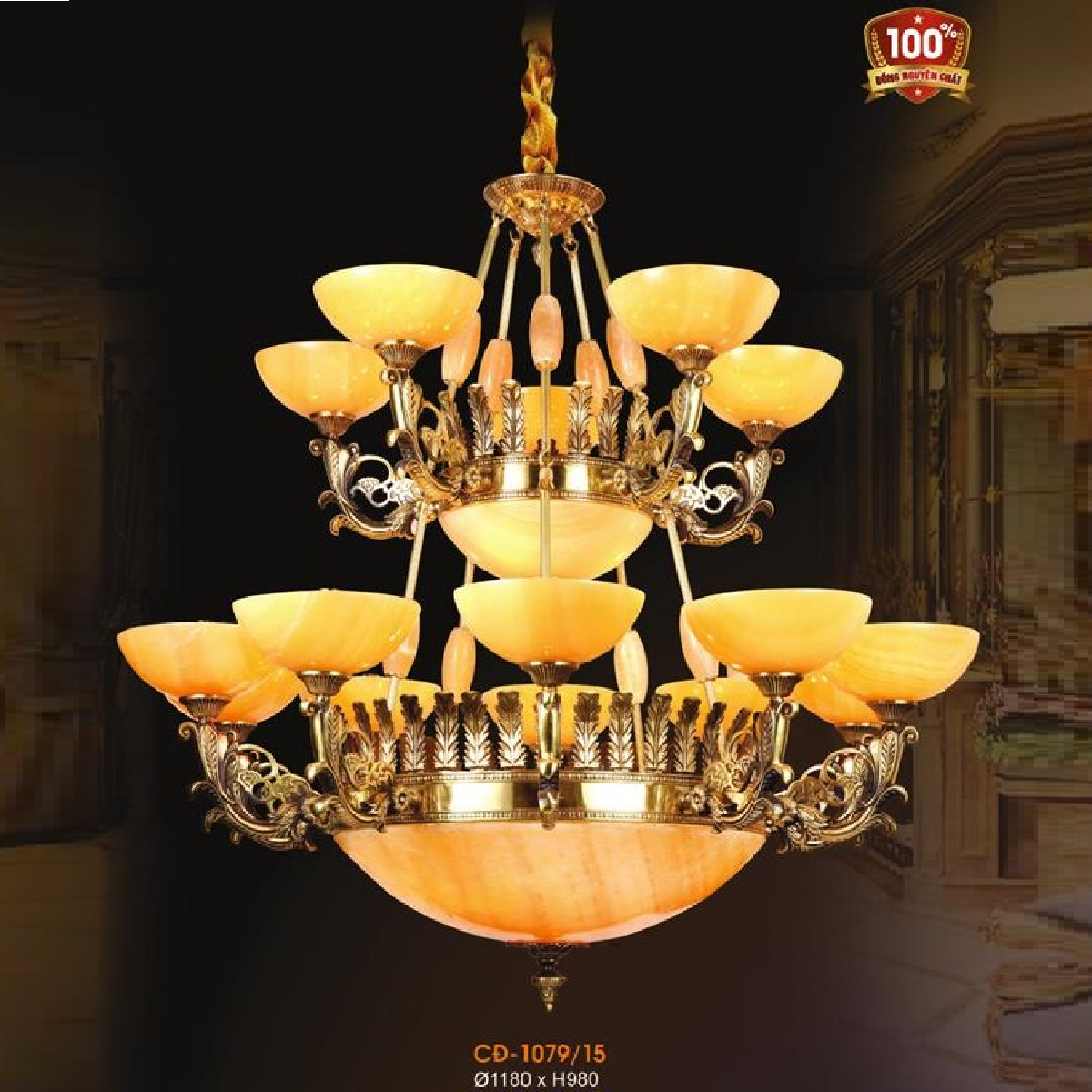 - Sản phẩm: CĐ - 1079/15: Đèn chùm đồng 15 tay, chao đá - KT: Ø1180mm x H980mm - Bóng đèn E14 x 18 bóng