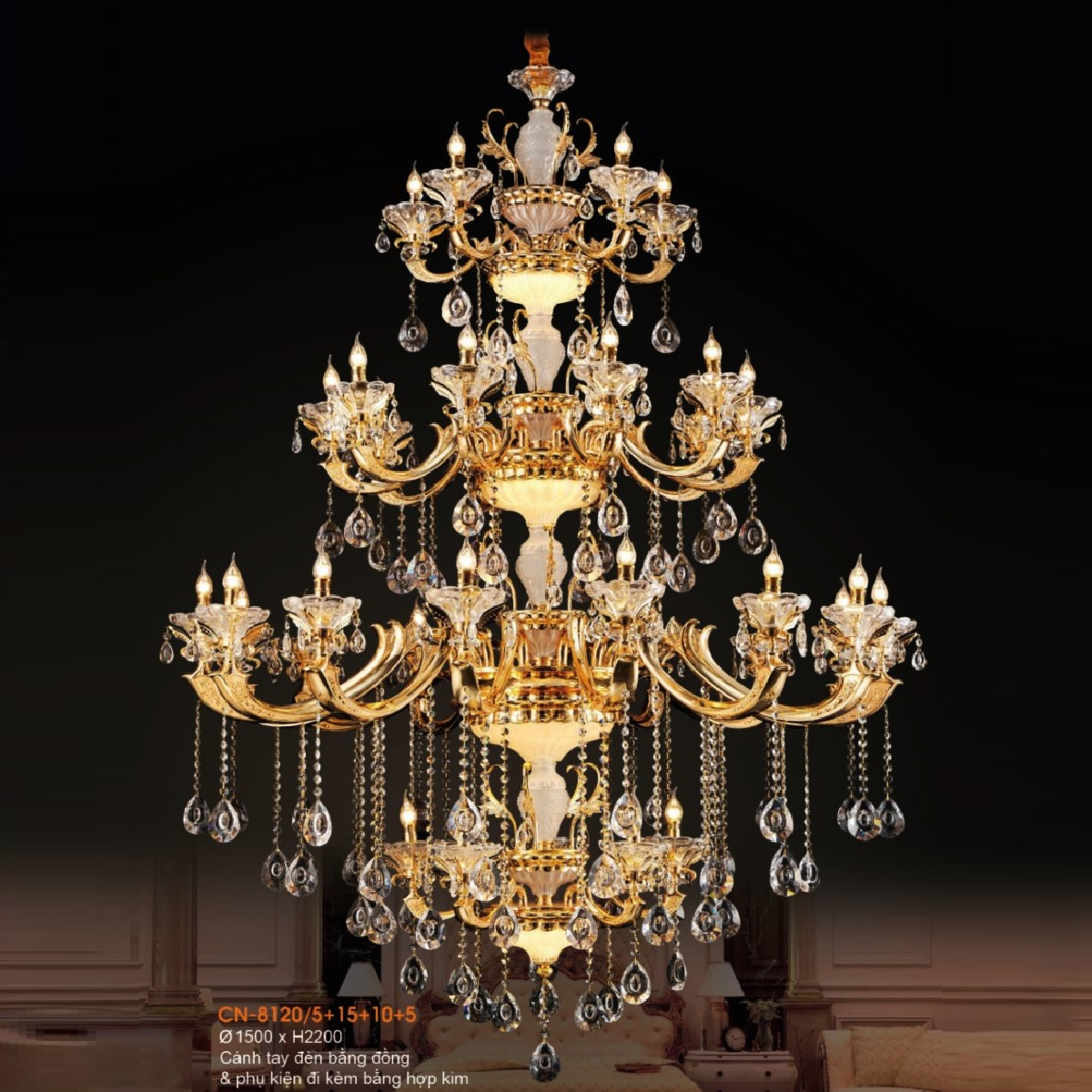 - Sản phẩm: VE - CN - 8120/5+15+10+5: Đèn chùm nến 35 tay - KT: Ø1500mm x H2200mm - Bóng đèn nến E14 x 35 bóng