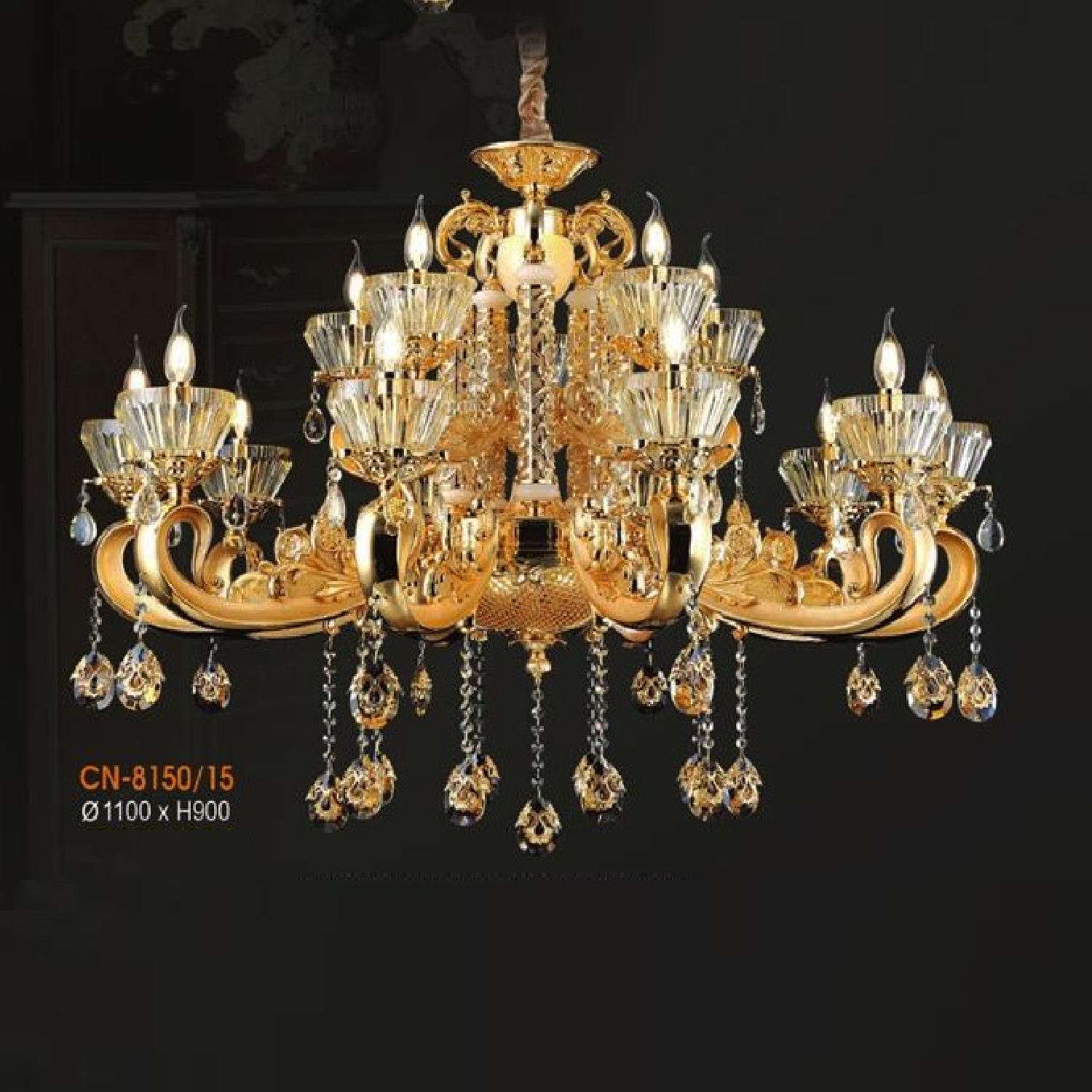 • Sản phẩm: VE - CN - 8150/15: Đèn chùm nến Phale 15 tay, chao thủy tinh - KT: Ø1100mm x H900mm - Bóng đèn nến chân E14 x 15 bóng
