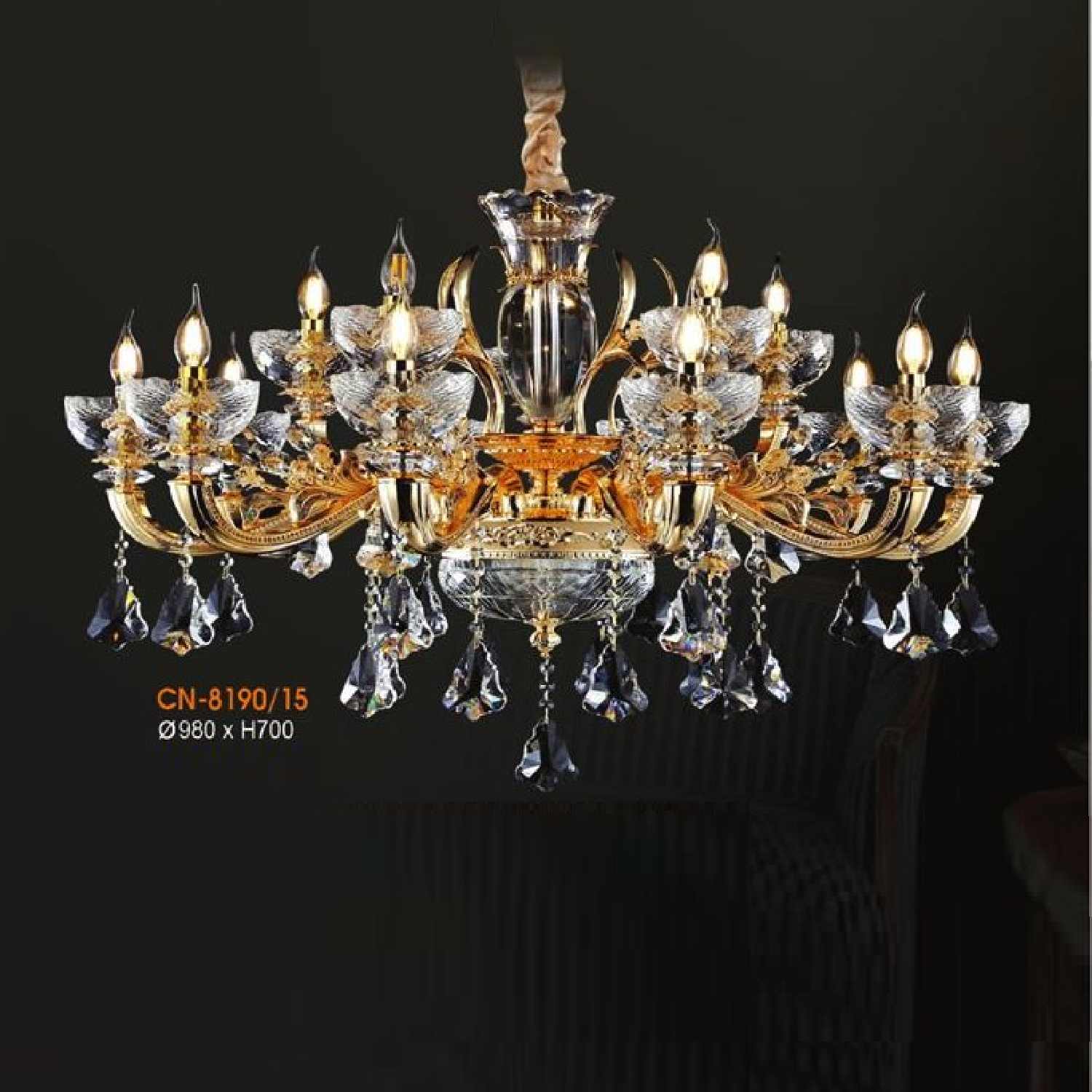 - Sản phẩm: VE - CN - 8190/15: Đèn chùm phale nến 15 tay, chao thủy tinh - KT: Ø980mm x H700mm - Bóng đèn nến chân E14 x 15 bóng