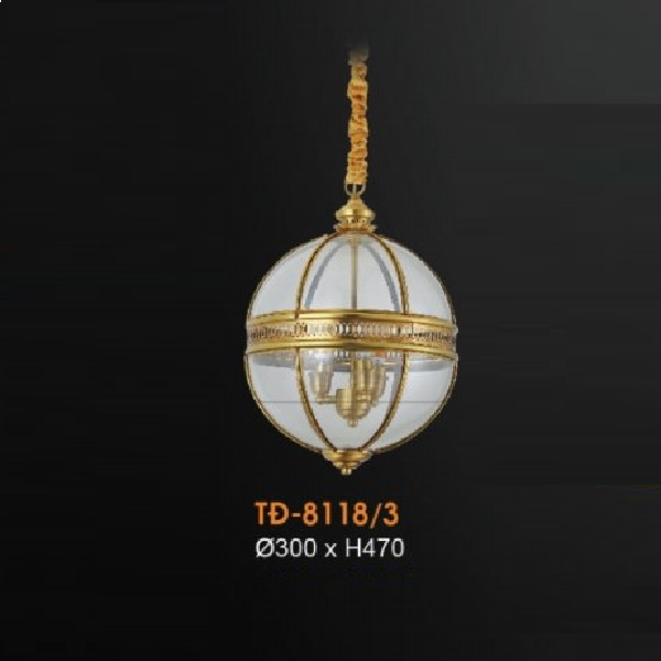 - Sản phẩm: VE - TĐ - 8118/3: Đèn thả đồng - KT: Ø300mm x H470mm - Đèn chân E14 x 3 bóng