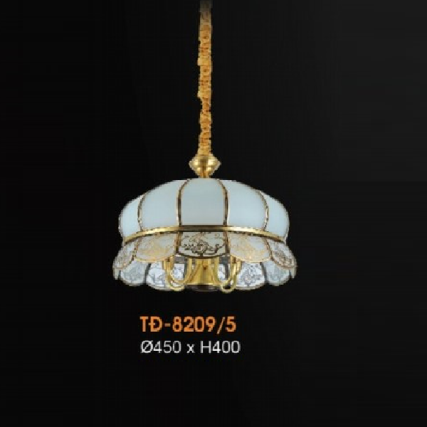 - Sản phẩm: VE - TĐ - 8209/5: Đèn thả đồng - KT: Ø450mm x H400mm - Đèn chân E14 x 5 bóng