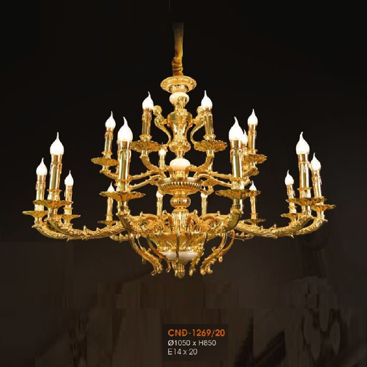 • Sản phẩm: VER - CĐ - 1269/20: Đèn chùm đồng đá 20 tay - KT: Ø1050mm x H850mm - Bóng đèn chân E14 x 20 bóng