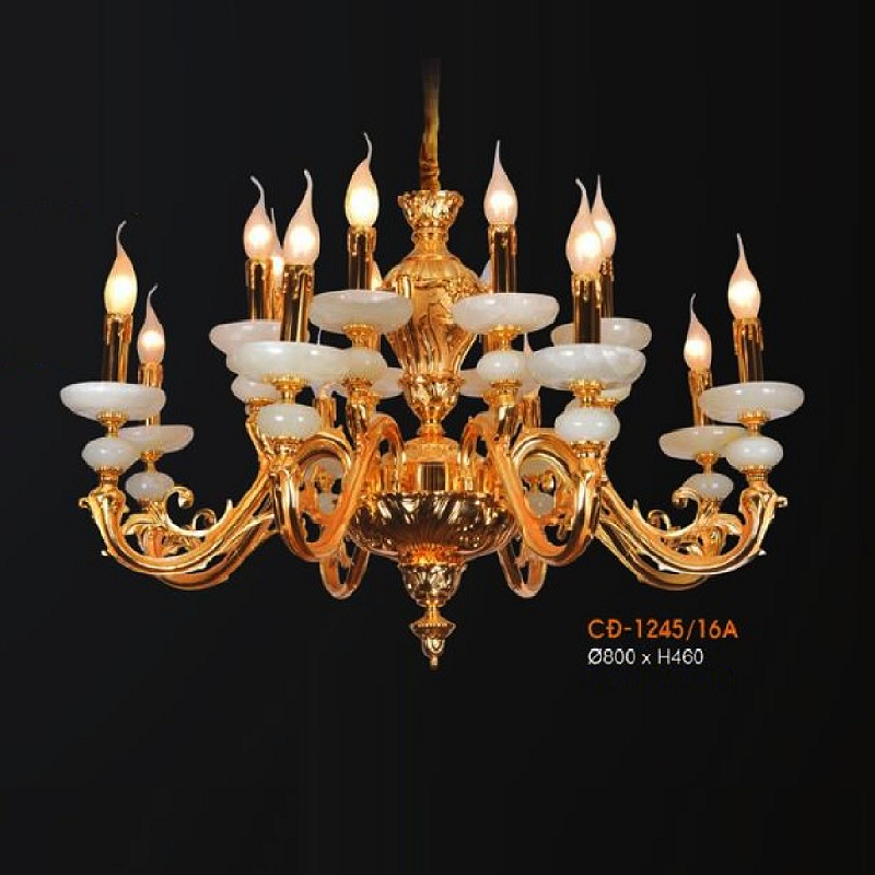 • Sản phẩm: VER - CNĐ 1245/16A: Chùm đồng 16 tay, chao đá - KT: Ø800mm x H460mm - Bóng đèn chân E14 x16 bóng