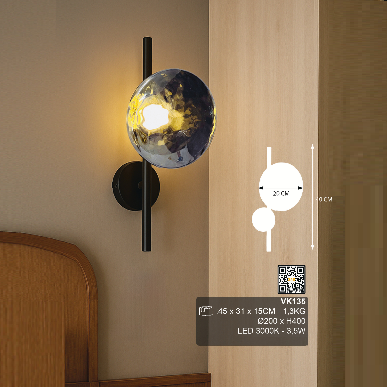 • Sản phẩm: VK135: Đèn tường LED - KT: Ø200mm x H400mm - Đèn LED 3.5W ánh sáng vàng 3500K